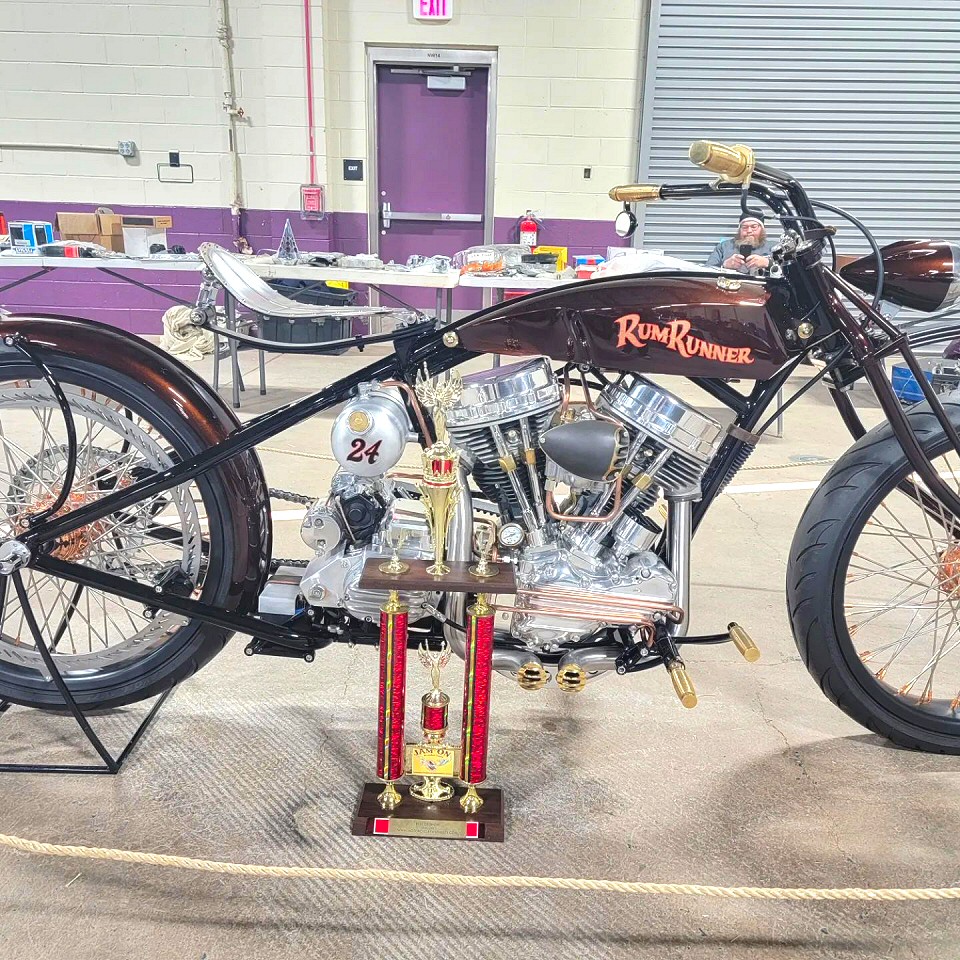 Took Home 1st Place, Panhead Class, at the Timonium International Motorcycle Show MD with our Custom Bobber Board Track Racer Build "Rum Runner".